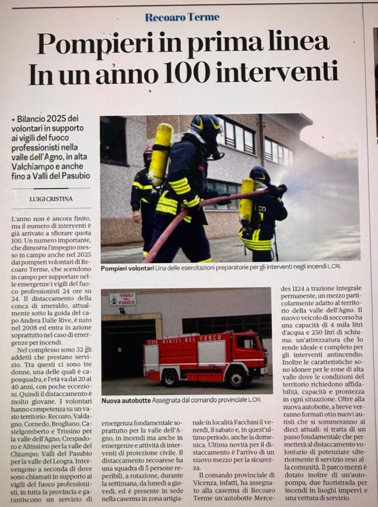 Certo non è tanto un record di cui vantarsi perché si sa che gli interventi dei Vigili del fuoco sono salvavita ed in gravi situazioni, ma l’apporto del nostro distaccamento di Vigili del fuoco volontari di Recoaro terme ha messo in evidenza la grande macchina che fa nel nostro distaccamento una piccola grande realtà…una vera missione, come sempre con la gente e per la gente in un soccorso tecnico urgente, ad persone animali e cose. Era impensabile in tempi remoti raggiungere questo obbiettivo, adesso arricchiti dalla nuova assegnazione di un ABP 4×4, ovvero un autobotte con 4000 litri di acqua.